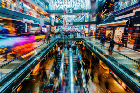 Vibrant shopping mall scene with escalators linking floors and shoppers exploring diverse stores