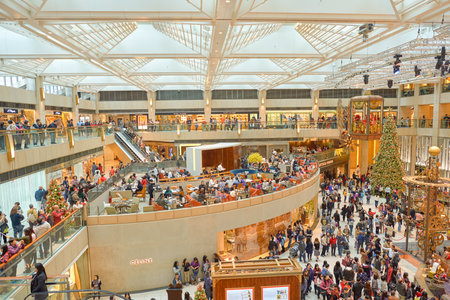 Parkview Greens shopping mall in Beijing with international brands from fast fashion to high-end luxury. Shopping mall with visitors during Christmas period. Beijing, China. December, 5th, 2019