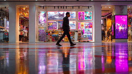 Man walking in a brightly lit shopping mall with reflections on the floor. A commuter strides purposefully on the urban street at night, passing by storefronts with vibrant displays and reflections.