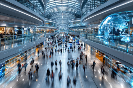 Blurred people walk through a modern shopping mall with a digital globe overlay
