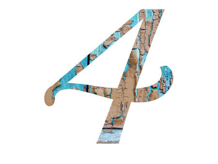 number 4 of the alphabet made from old planks with blue and brown paint on them, isolated on a white background