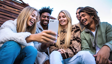 group of friends of different cultures laugh joyfully in an urban environment sharing stories and celebrating their unique backgrounds under clear skies.