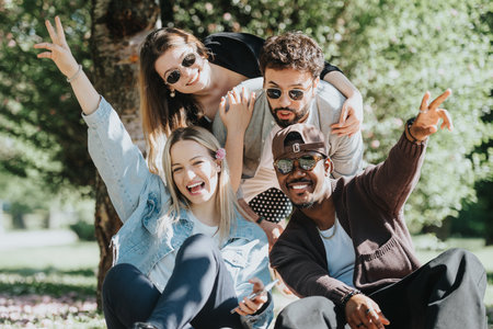 Joyful friends hanging out in a sunny park, showcasing happiness and togetherness