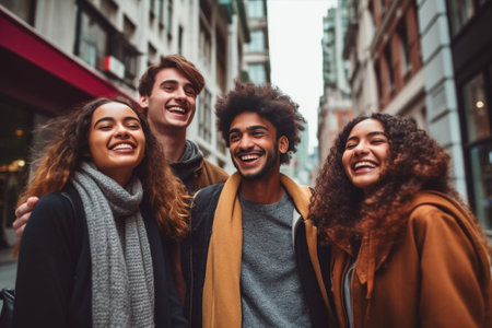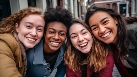 Generative AI : Multicultural best friends having fun hanging out together Happy young people laughing walking on city street International students talking outside school in col