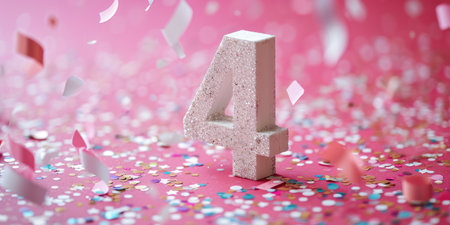 Number 4 on pink background with sequins and confetti. Ai generation.