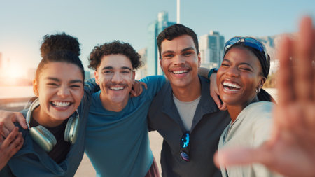 Happy people, portrait or fitness with selfie for picture, photography or memory together in city. Active, group or friends with smile in joy for capture moment, social media or post in an urban town