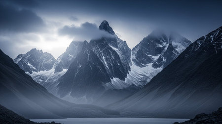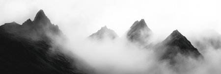 Fog envelops towering mountain peaks, creating an ethereal ambiance as shadows meld with the mist. The scene captures natures wild beauty and depth.