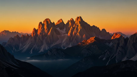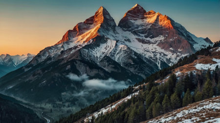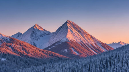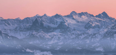 Breathtaking snow-covered mountain peaks are illuminated by the warm light of sunset. The scene captures the tranquility of the Alps, showcasing their majestic beauty in winter.