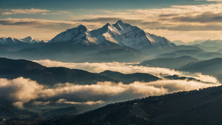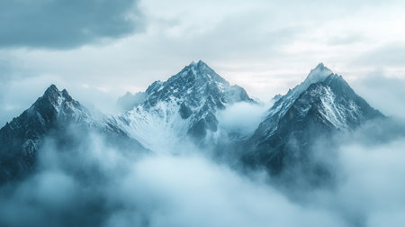This stunning image captures a snow-capped mountain range bathed in soft morning light. The mist adds a tranquil touch to the expansive landscape, inviting exploration.