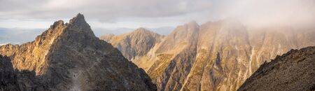 Detail of Foggy Mountain Peaks at Sunrise with Golden Light in High Tatras, Slovakia