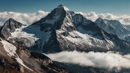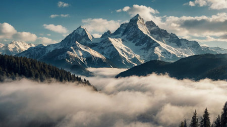 Beautiful alpine mountain landscape with snow covered peaks in the clouds