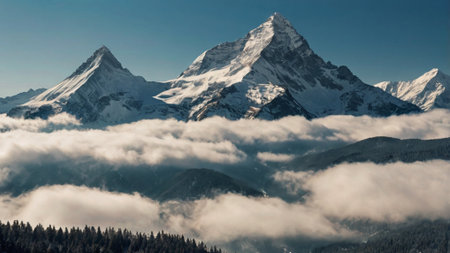 Majestic mountains enveloped in clouds under a clear sky