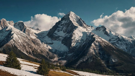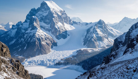 Breathtaking Winter Landscape with Majestic Snow-Covered Peaks and Serene Blue Sky Above