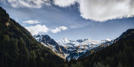 Mountain landscape with snow-capped peaks and coniferous forest