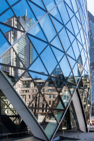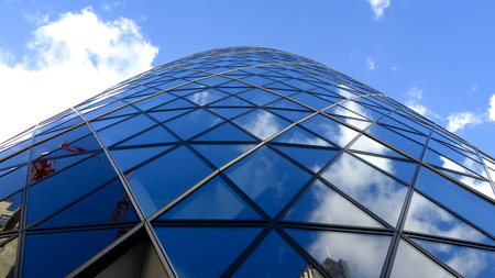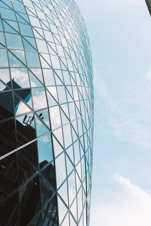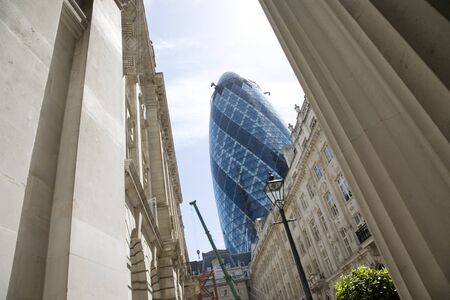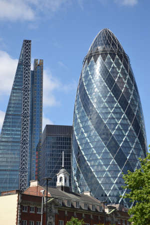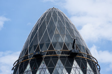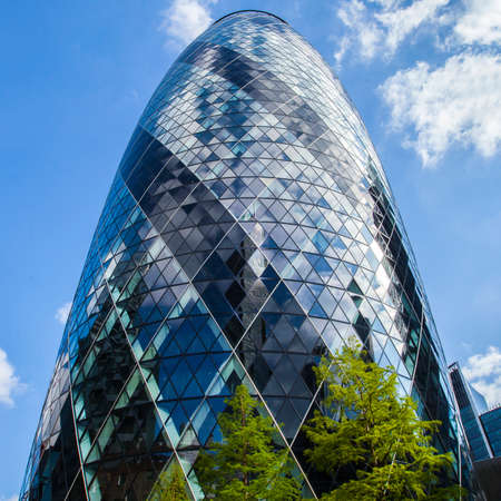 London, UK - May 25, 2011: Outsid view of 30 St Mary Axe, likely being called Gherkin, 30 St Mary Axe was completed in December 2003 and now this is one of the most iconic modern buildings in London.