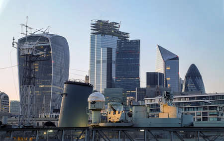 London, England - Apr 20, 2019 : HMS Belfast museum ship moored on the River Thames with modern high-rise buildings in the background. City skyline, No focus, specifically.