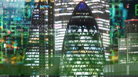 london skyline with computer code and data