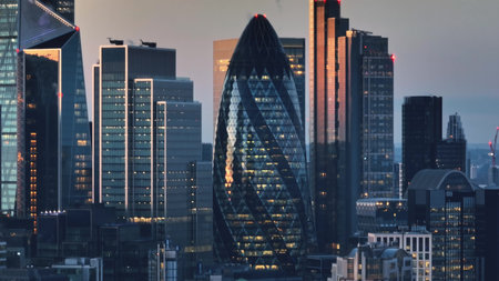 United Kingdom, London: Aerial view capturing the London skyline at sunset, highlighting modern skyscrapers and the iconic Gherkin amidst the cityscape. Drone flight