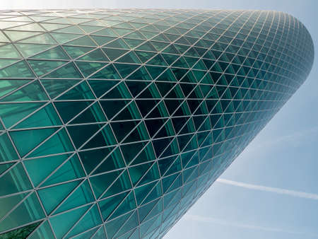 Abstract view of glass curtain wall in modern office buildings with reflections.