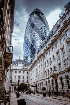 LONDON, UK - AUGUST 21, 2015: Street view in the City of London with Gherkin Tower