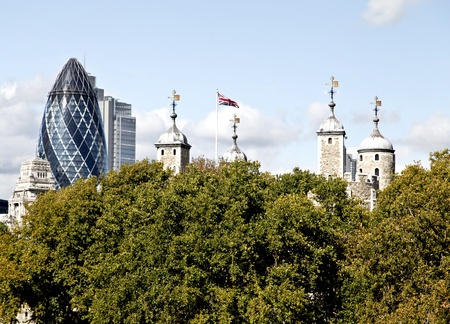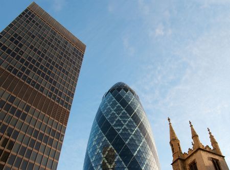 An old tower top, a typical office highrise and the modern swiss re building in London City