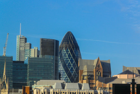 View of buildings of London with the famous 30 St Mary Axe Building, also known as the Gherkin, in the center of the image
