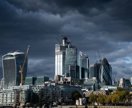 London, United Kingdom - October 18 2018: Heavy clouds gather over the skyscrapers of London's City dictrict