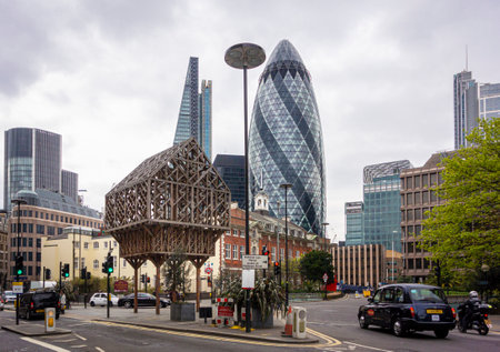 London Cityscape Featuring Iconic Gherkin Building and Historic St Andrew Undershaft Church