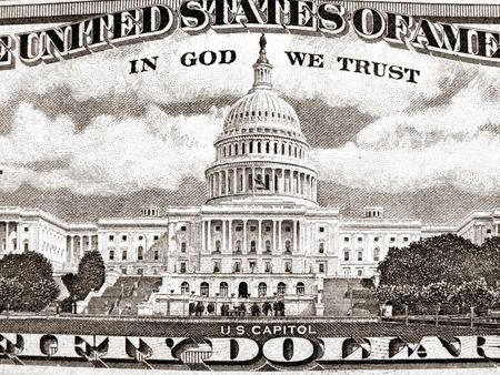 Extreme closeup of United States Capitol depicted on 50 USD bill reverse with the words In God We Trust. Shallow depth of field