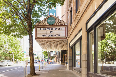 Portland, OR, USA - June 27, 2018: Arlene Schnitzer Concert Hall entrance in downtown Portland, Oregon, United States