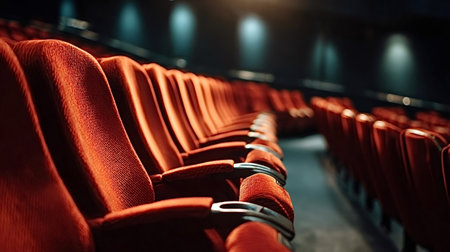 Rows of vibrant red seating filling an empty movie theater, cinema, or concert hall auditorium, suggesting anticipation for a film screening, performance, entertainment event, or cultural experience