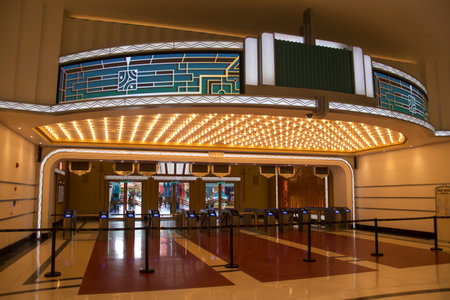 Large cinema theater interior with seat rows for audience to sit in movie theater premiere by cinematograph projector. The cinema theater is decorated in classical for luxury feel of movie watching.