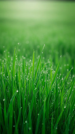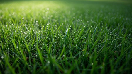 Close-up view of vibrant green grass blades adorned with numerous sparkling dew drops, creating a refreshing and...