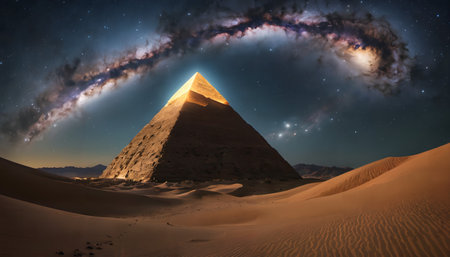 A majestic image of an illuminated pyramid standing tall in the desert at night. The pyramids apex is glowing under the vast expanse of a starry sky. The Milky Way galaxy arches gracefully above the pyramid, creating a breathtaking celestial backdrop. The surrounding sand dunes add to the mystique of the scene, reflecting subtle shadows and light.