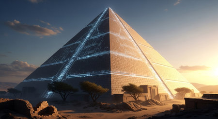 a futuristic pyramid in the desert with digital lines and a bright sun setting behind