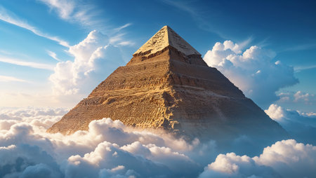 A mystical pyramid rises above the clouds at sunset, illuminated by soft light, evoking a sense of wonder and ancient mystery.