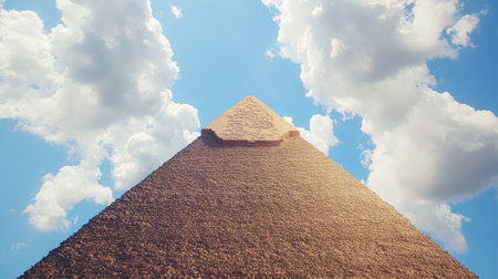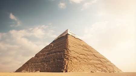 Majestic pyramid rising from the barren desert, with ample copy space in the clear sky and surrounding sand.
