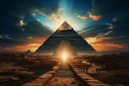 hazy, atmospheric shot of a pyramid at sunrise, created with generative ai