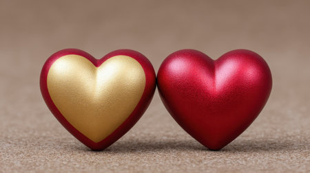 This image features two heart-shaped decorations, one red and one gold, creating a romantic ambiance. Ideal for themes of love and special occasions.