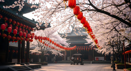 Beautiful cherry blossom and red lanterns in Hangzhou, China