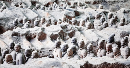 A row of terracotta warriors standing in formation, a historic treasure. No people, copy space.