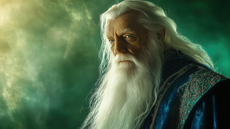 An elderly man with striking blue eyes and a long white beard stares intently against a cosmic backdrop.
