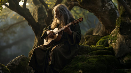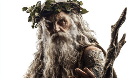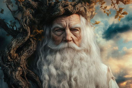 An elderly figure, resembling a tree spirit, stands amidst a magical forest, surrounded by ethereal light.