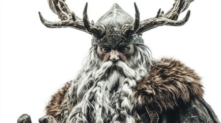 Druid old man with long grey hair and beard on serious face with wooden mug in hands outdoor on wood background with iron decoration