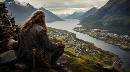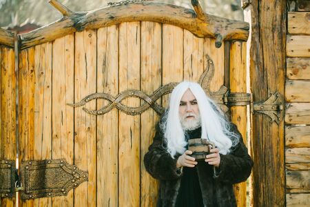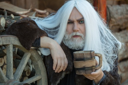 Druid old bearded man with long grey hair and beard in fur coat with wooden mug in hands near wheel outdoor