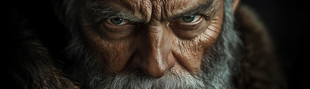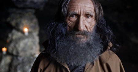 An Elderly Man with Long Hair and a Beard in a Cave Setting during Candlelight Hours
