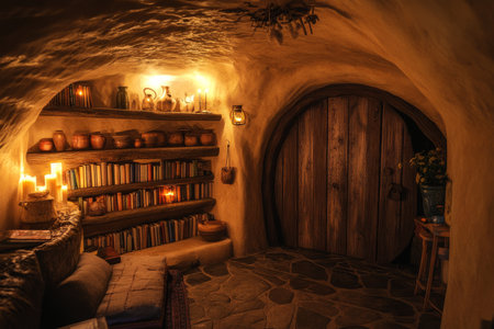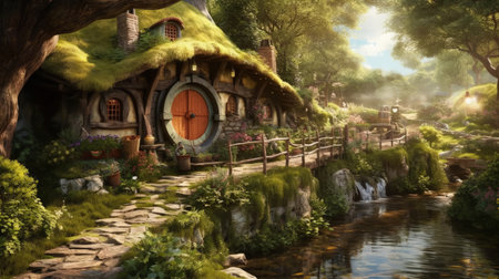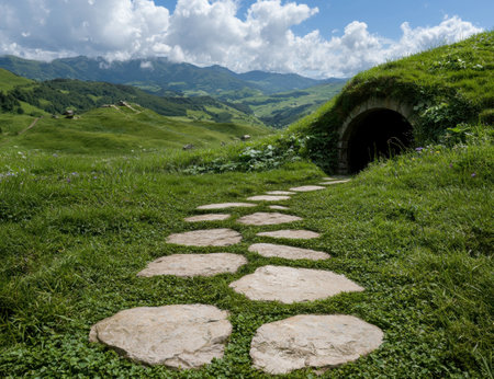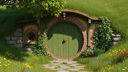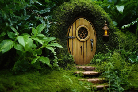 beautiful green burrowed home for hobbits in central american nature landscape with a yellow door