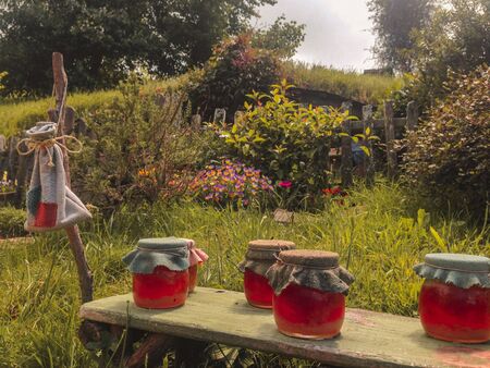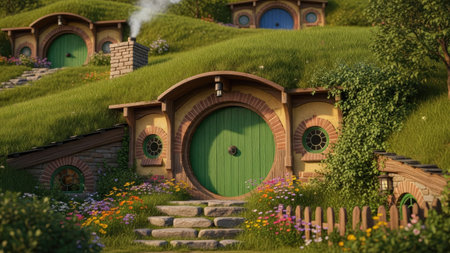 hobbit holes and hobbit garden in hobbiton movie set, new zealand. Taken during summer.