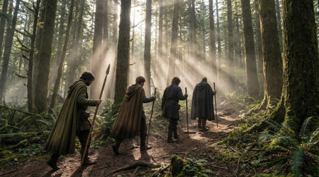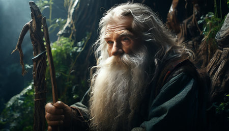 A wise-looking elderly man with a long, white beard is gazing intensely from under a dark hood in a forest.