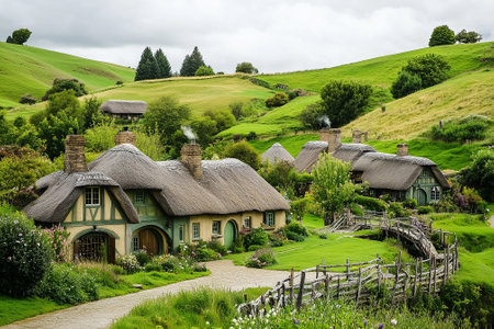 Hobbiton Movie Set, Matamata, New Zealand - 11 06 2023: Panorama of Hobbiton, Hobbit and Lord of the Rings Movie Set. Beautiful Shire village, panorama.